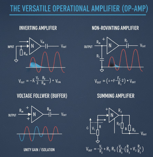 These rules simplify complex circuit analysis, allowing the Op-Amp to be used in numerous configurations. Common applications include the inverting amplifier, which changes the sign of the input signal while amplifying it, and the non-inverting amplifier, which maintains the input signal’s phase. Other vital roles include precision voltage followers, active filters, and the creation of summing and difference amplifiers that perform actual mathematical operations on electrical signals.